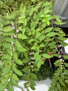例年、伸びすぎて実に色が付く前に、お隣のマンションの出入りに邪魔にならない様に、バサバサ切ってしまう紫式部なのですが、今年は実がつく前にバサバサ切ったので、そんなには邪魔にならない様で、色づきが見えました。とは言え、そろそろ限界かしら…